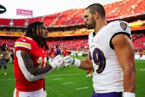 Sep 28, 2025; Kansas City, Missouri, USA; Baltimore Ravens tight end Mark Andrews (89) and Kansas City Chiefs running back Isiah Pacheco (10) greet each other on the field after the game at GEHA Field at Arrowhead Stadium. Mandatory Credit: Denny Medley-Imagn Images